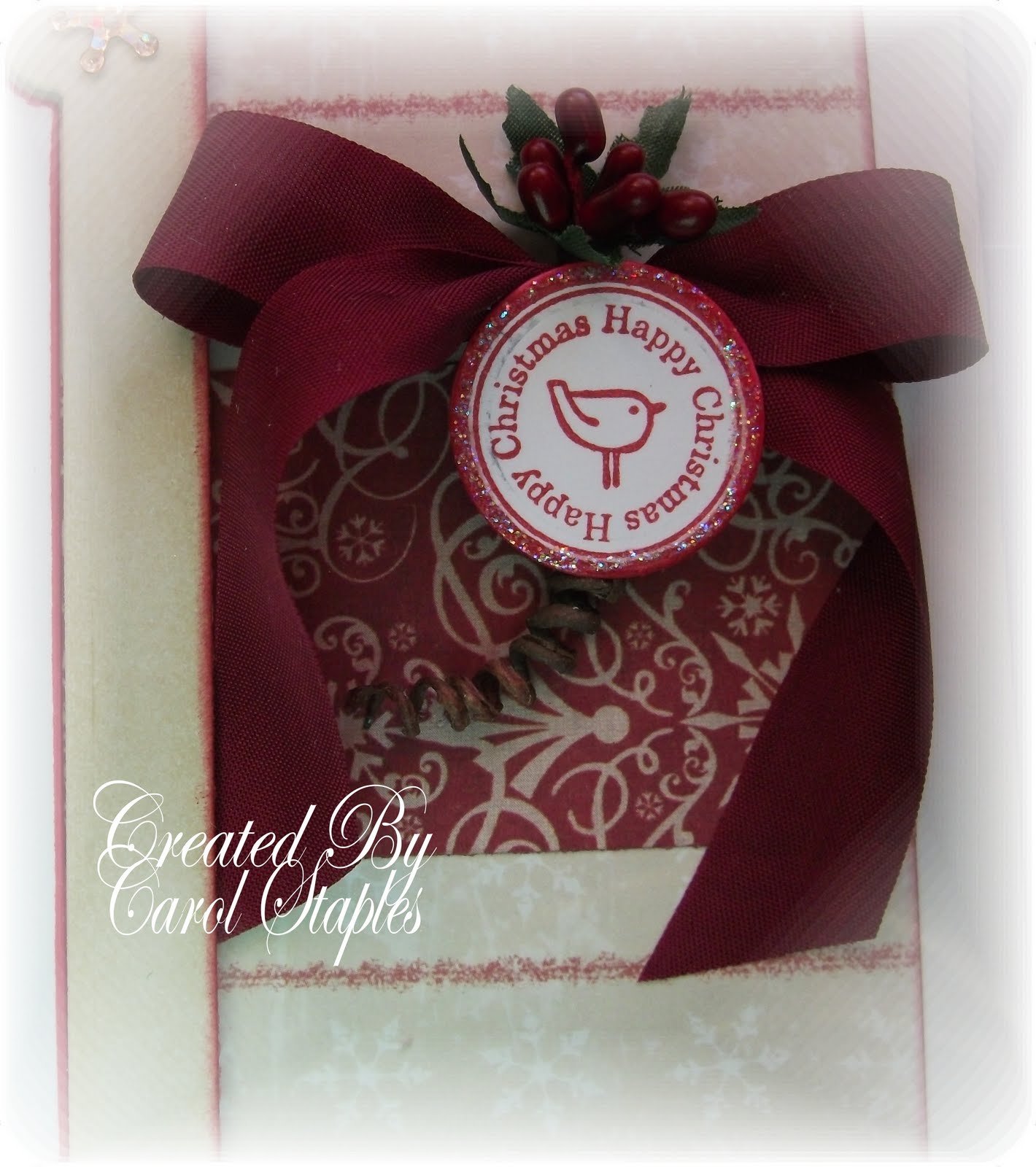 The ribbon I also bought at the show. A bargain at 6mts for £1!! The stamp was a free gift with a Mag. The Berries I have had a couple of years!